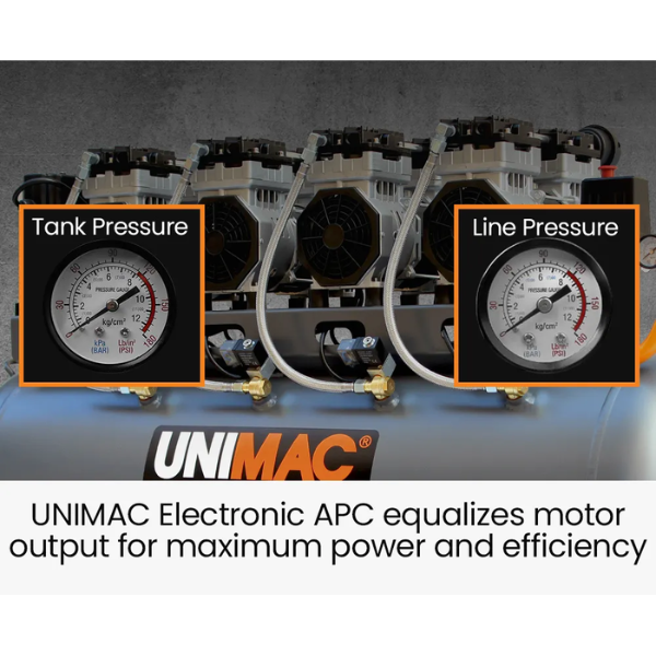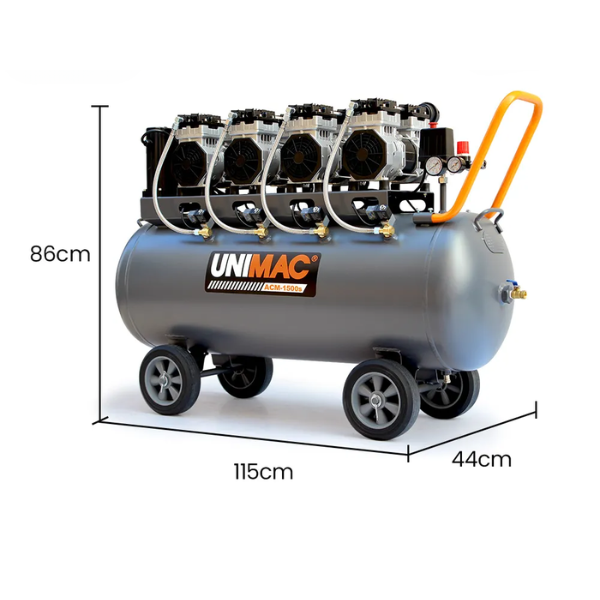 The Unimac ACM-1500s Quiet Air Series is a high-capacity, ultra-silent compressor built for professional and workshop environments. With a 150L tank, quad oil-free motors, and twin Nitto outlets, it delivers clean, reliable air with minimal noise.