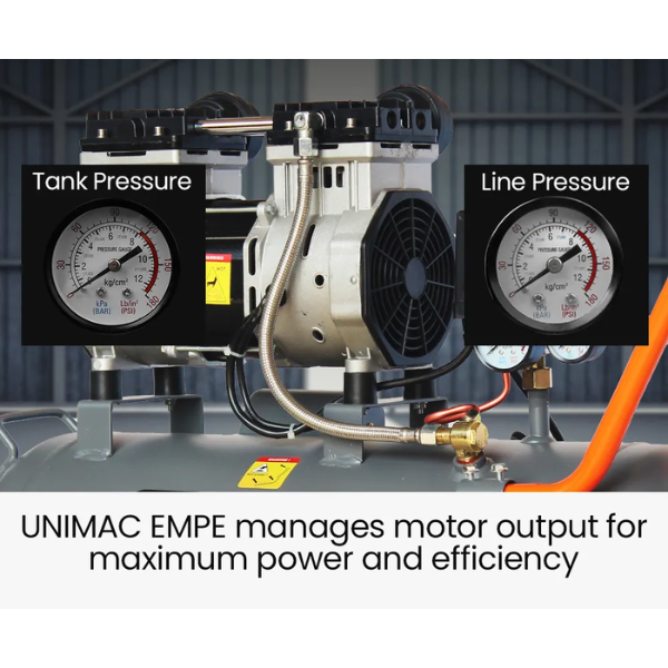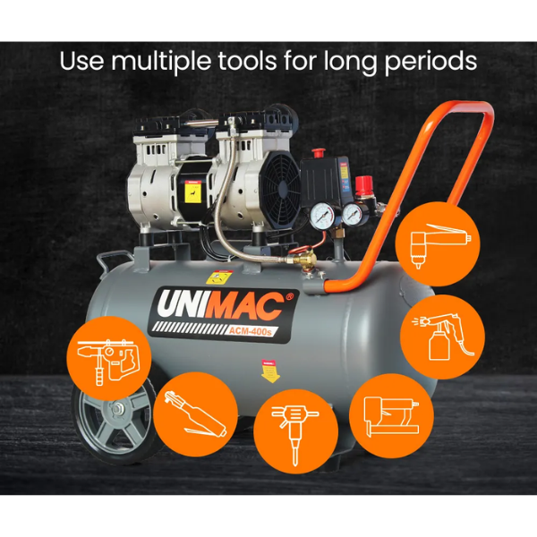 The Unimac ACM-400s Quiet Air Series offers reliable compressed air in a compact, low-noise design. With a 40L tank and twin Nitto outlets, it’s ideal for workshops, home projects, and light trade use.