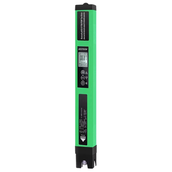 - Measures pH (0.00–14.00), EC, TDS, CF, and water temperature
