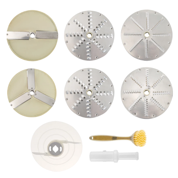 - Six detachable cutting disks: H3 (3mm shred), H4 (4mm shred), 2 x H7 (7mm shred), P2 (2mm slice), P4 (4mm slice)