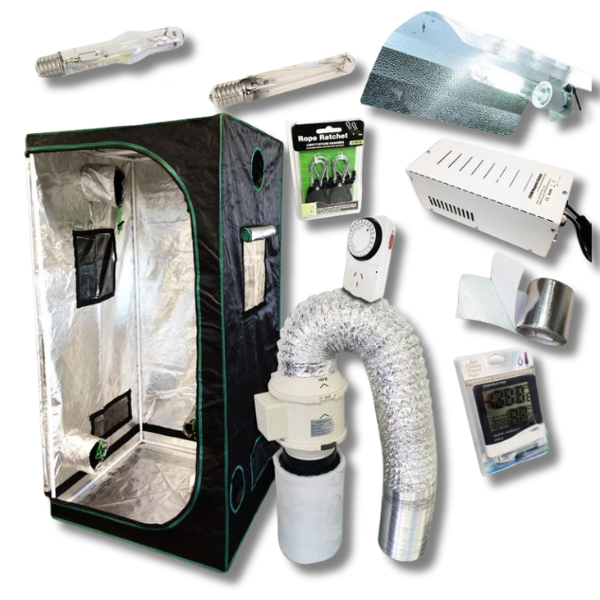 Compact yet powerful grow room kit featuring a reflective Mylar tent, dual-spectrum HID lighting, and efficient ventilation. Designed for reliable airflow, broad light coverage, and controlled indoor growing in smaller spaces.